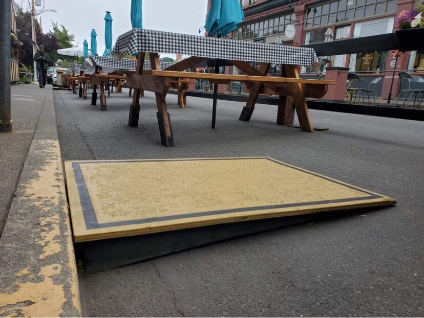 Friendly and accommodating staff happy to set up low slope ramps to accommodate 2 small steps at front door of the pub. The back room is up additional steps.